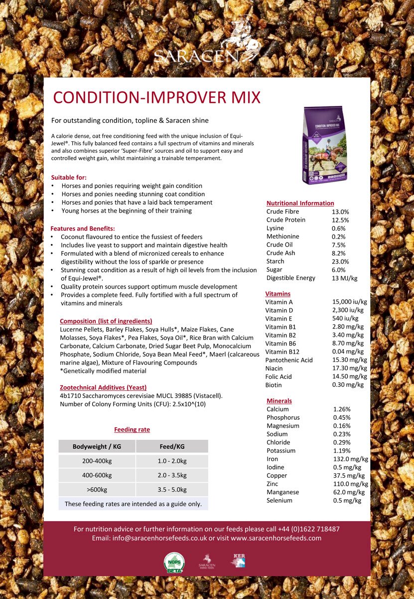 Saracen Condition-Improver Mix jest przeznaczone dla koni słabo przybierających na wadze. Mieszanka musli wyraźnie poprawia kondycję koni szczególnie wymagających, przyśpiesza poprawę wyglądu, utrzymuje rzeźbę mięśni i blask sierści. Wysoka kaloryczność musli bez owsa sprzyja kontrolowanemu przyrostowi masy ciała bez efektu niepożądanej nadpobudliwości. Pasza polecana dla koni startujących w zawodach, wystawach, mających problemy z utrzymaniem wagi i masy mięśniowej.