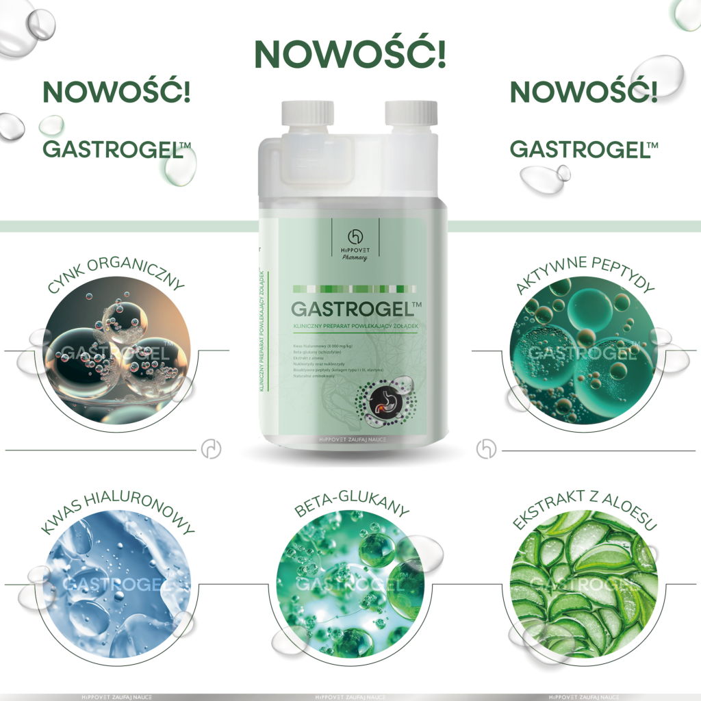 GASTROGEL to kliniczny preparat zawierający wielkocząsteczkowy kwas hialuronowy, beta-glukany i nukleotydy w otoczkach aloesowych, które tworzą warstwę ochronną, powlekająca błonę śluzową żołądka przyspieszając gojenie się nadżerek żołądka. Połączenie b-glukanów izolowanych z drożdży oraz grzybów stymuluje procesy gojenia. Dodatek organicznego, chelatowanego cynku przyspiesza procesy gojenia się nadżerek żołądka i uzupełnia obniżony poziom cynku w organizmie. Bioaktywny skład uzupełnia ekstrakt z aloesu oraz nukleotydy, który minimalizują ból związany z występowaniem wrzodów żołądka, powlekają i regenerują nadżerki żołądka.